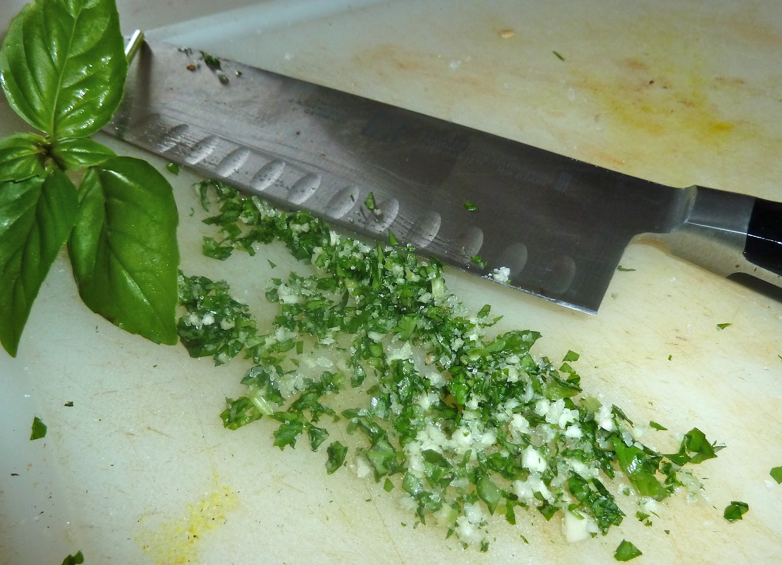 I started by making an basil garlic salt. Don't know how to make an herbed garlic salt? It's easy. Pile up the herbs, garlic clove, and salt on a cutting board and keep mincing and mashing until it's tiny, crumbly, and combined. You can use this for all sort of other dishes. A few days ago I made a basil garlic salt to mix into dumplings I was making.