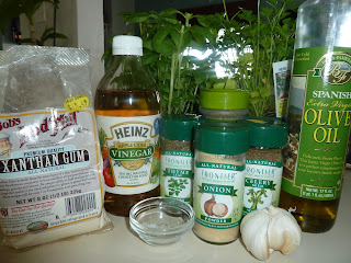In my mission of replacing my fridge door items with homemade ones, I've been wondering how I was going to pull off a good salad dressing replacement. Other people make salad dressings I enjoy but I've never made one myself that I'm satisfied with. Usually they're too runny for me. It's the consistency I can't get right. Last week, I noticed one of our grocery stores carrying a new line of all-natural salad dressings. Every ingredient listed on the back was familiar (except for the always mysterious "natural flavors"). They also had an unexpected ingredient: xanthan gum. I know xanthan gum is used as a stabilizer and I already had some at home in the freezer. I use it to make a vegan butter substitute. It's not cheap, but a little goes a loooong way. A quick search on the google machine revealed several salad dressing recipes that used xanthan gum. It was good to read some examples of how to use it, but unfortunately none of those dressings appealed to me. Seth had also already requested Italian dressing. So another quick google search later and I had thousands of basic Italian dressing recipes...minus the xanthan gum. Time to glean what I could from what I had found and then strike out on my own.