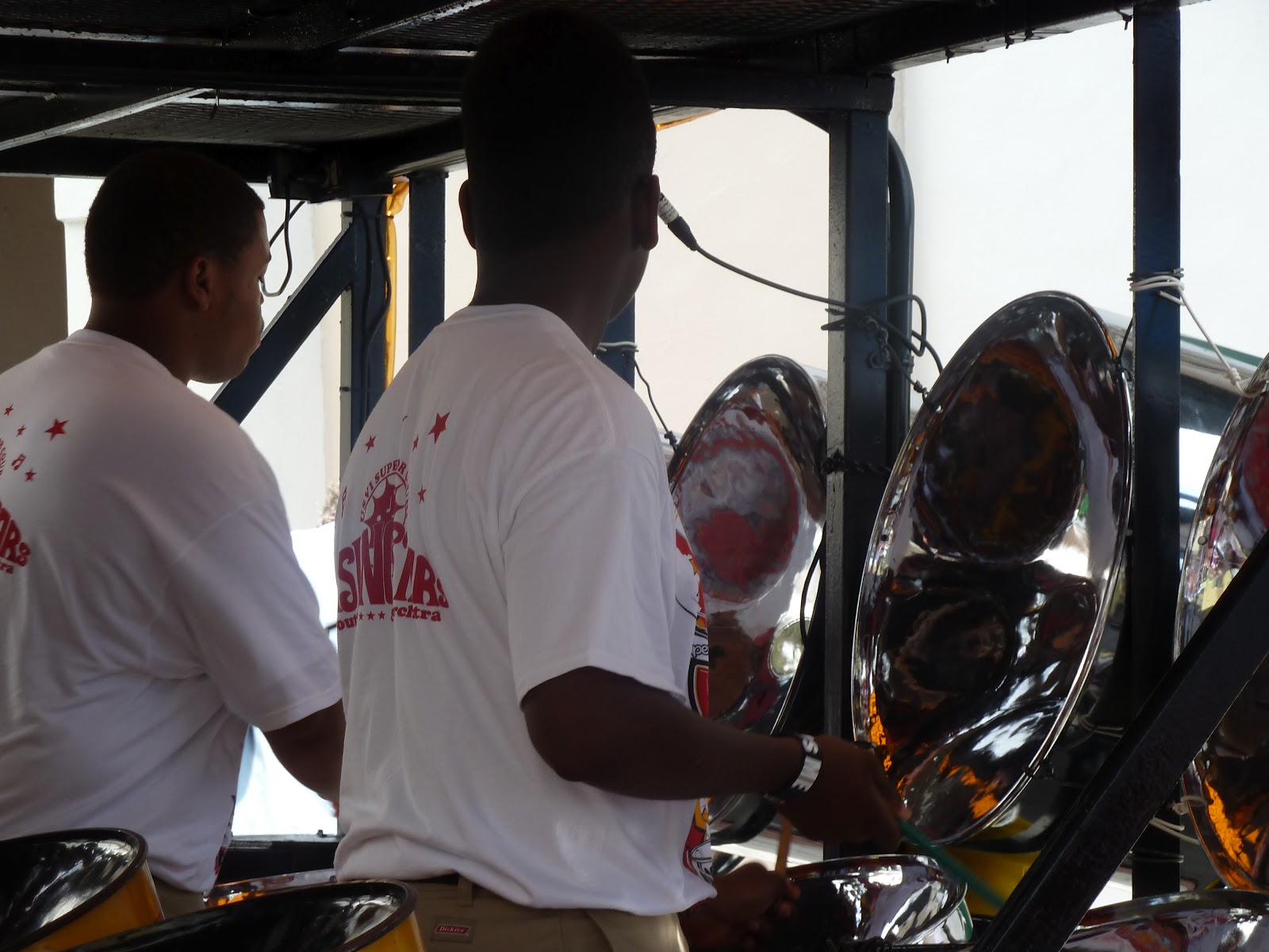 The food fair is now called the cultural fair because it celebrates all sorts of St. Thomas traditional culture, not just food. We were around for little quadrille dancers, larger quadrille dancers, and steel pan music. The quadrille lady did not want her picture taken and kept scowling at me. But my theory is if you wear that get-up out for a public event, you don't have a choice. The hubcap player agreed with my theory so he grinned and totally hammed it up for my photos. Thanks for being a good sport hubcap dude. (Warning: if you choose to proceed beyond this point, the computer stopped allowing to edit my photos. This is raw footage, ladies and gentlemen. Prepare yourself for over exposed skies and blinding glare off the steel drums. If you can stomach it.)