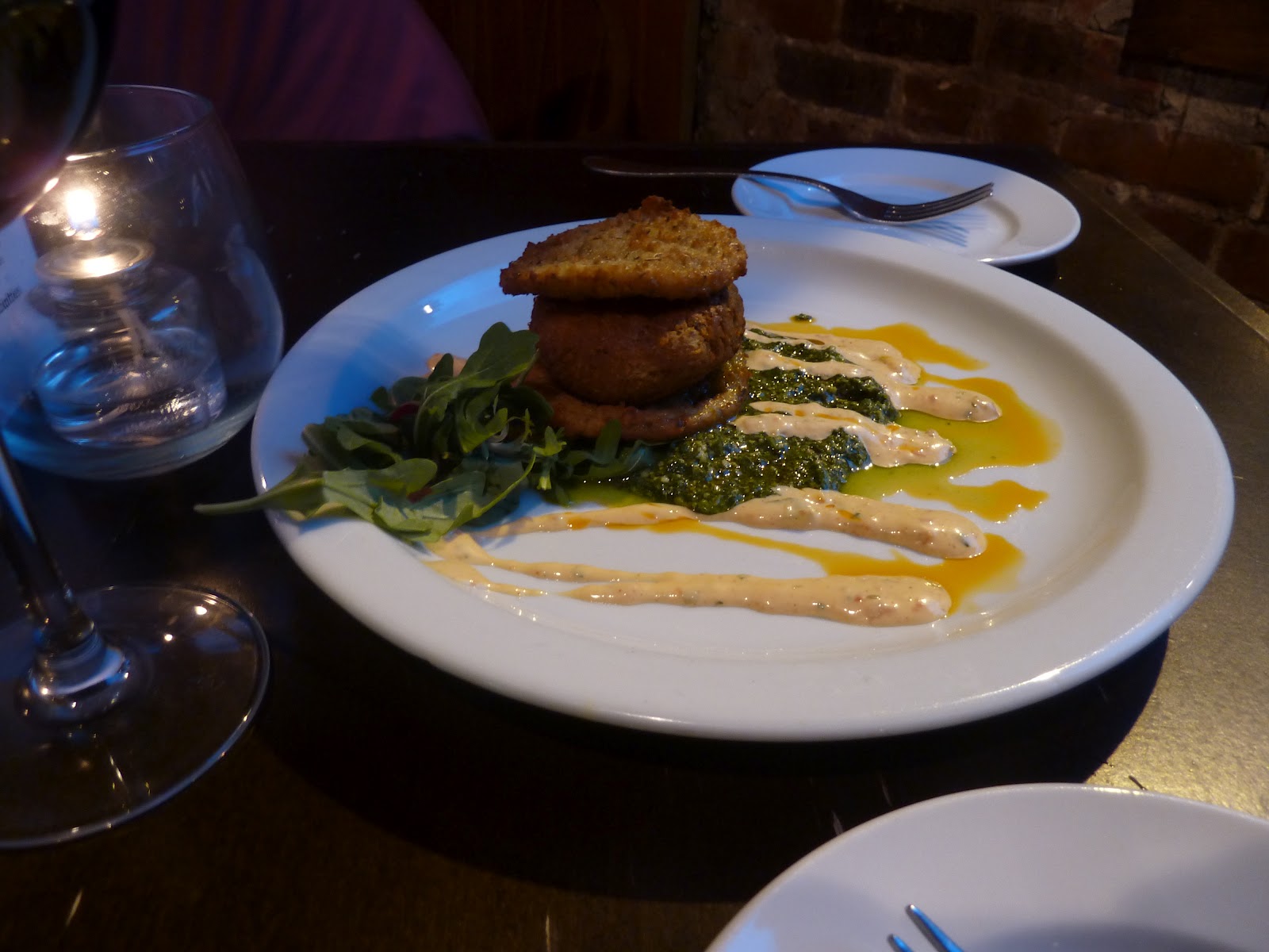 Our fried green tomato and (local) crab cake appetizer at B. Matthews