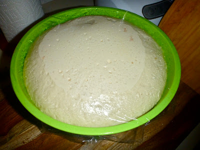 You want your water to be warm but not hot (or it kills the yeast). Sprinkle the yeast into the water and let it sit for about 5 minutes. The yeast should sort of dissolve and turn bubbly. Mix your flour and salt together in the mixing bowl. After 5 minutes, add the yeast/water mixture and the olive oil slowly and mix together. It turns into a really gooey ball of dough. At the point I let the dough hook do the kneading for about 5 minutes. If you need it by hand, good luck. (If you need by hand, maybe use less flour from the start and add it in gradually as you knead it? You're going to need a lot of flour on your hands and the counter. Your hands are going to be on sticky mess so don't panic. This is a much stickier dough than any other I make.) When you're done kneading, transfer the dough into a large bowl sprayed with non-stick spray. Let it rise for 1 hour if you live on St Thomas and don't have air conditioning. Maybe 1 1/2-2 hours if you live anyplace normal.