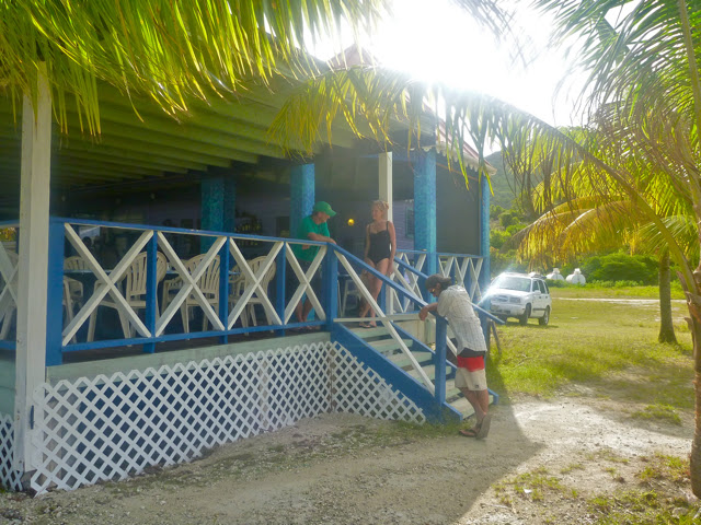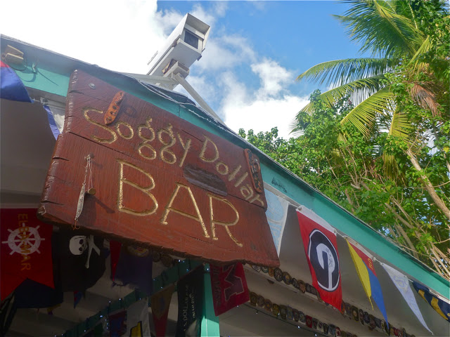 ...we hiked back to the boat and went over to White Bay to hit up Soggy Dollar. If you haven't heard of the Soggy Dollar, it gets its name because there is no dock. You have to jump of your boat and swim in to get there. Over the cash register they have a line for drying out all the "soggy dollars" people pay with.