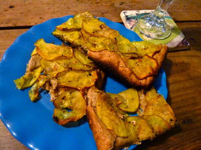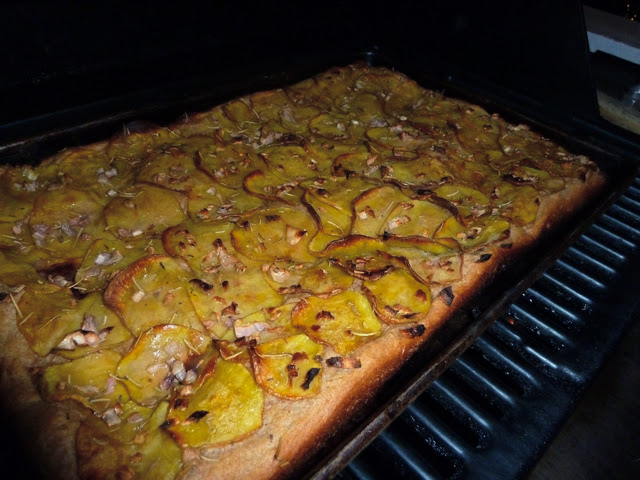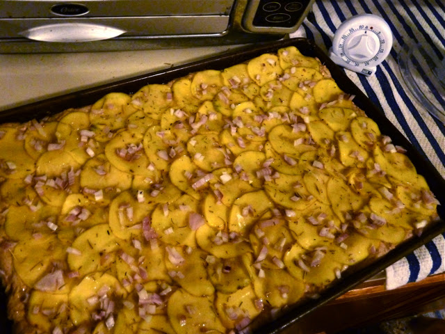 Heat the oven to 500F. After the dough has risen, spread 2/3 of the pizza crust out on an oiled sheet pan with raised edges (mine was 12'x21"). You can wrap the remaining 1/3 of the pizza dough tightly in saran wrap and keep in the freezer or fridge for a small pizza later. The dough should spread into a thin layer. Spritz it with olive oil. Drain the potatoes in a colander and press out the excess water. They should be limp and squeezable. Blot them dry with a paper towel and layer then thinly on the crust. Sprinkle with the onion and rosemary. Drizzle olive oil over the top. Bake on the middle rack for 30 minutes until the potatoes are golden brown. Check halfway through cooking and move to the top rack if you think the bottom of the crust is getting too much heat. Sprinkle with salt and cut into squares. Makes 4-6 servings.