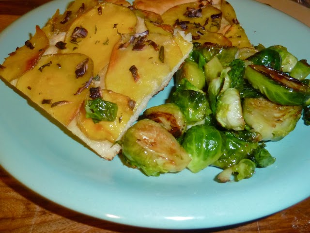 Then a week later you find the time to rally. You try again. This time you tweak it and use red onion (not shallots) and fresh rosemary (not dried) from the plant you just bought that will likely die when you leave to spend Christmas with family. You pick a cool evening (I mean, it's got to be, what, 83 degrees?) so that you can crank that oven up to 500F and you put the pizza on the middle rack. You even use only 2/3 of the pizza dough for a thinner crust, leaving you with a ball of pizza dough in the freezer for another day. And you braise some brussels sprouts.