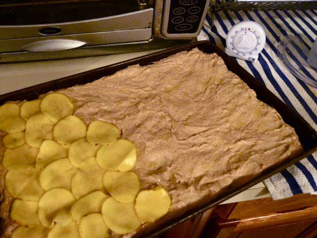 I started with making a batch of my foolproof pizza dough. The same time I made that I used my fancy-pants mandolin (thank you Discover points!) to slice up three potatoes on the 1/8 inch setting. After referring to about 82 recipes to get my bearings, I threw the potatoes into an icy salt water brine and let them soak for the 1 1/2 hours that the pizza dough was rising. Then I stretched the dough out on sheet pan and layered the potatoes on top.