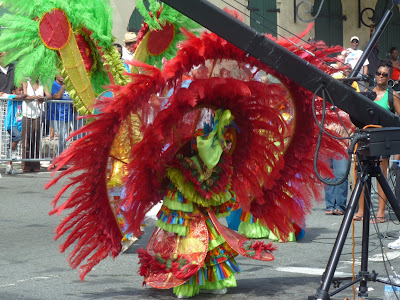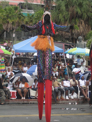 As promised, with a break for the everlasting technical difficulties, here is more of the neon, noise, and food that make up St. Thomas Carnival. There are two parades during Carnival week, a children's parade on Friday and the adult parade on Saturday. Both parades are made up of the same essential elements: neon feathers, neon sequins, steel pan, mocko jumbie stilt dancers (yup, not really walkers. dancers.), speakers the size of your living room strapped to flat bed trucks, and huge dose of cultural pride. The biggest difference marking the two parades is that on Friday the participants are smaller and drink gallons of water as they travel the many-hours of parade route. On Saturday the participants are larger and drink gallons of rum as they travel the many-hours-long parade route. In my observations, most other differences in the parade stem from those two.