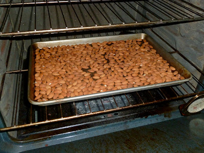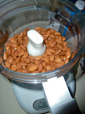 And so, with my one new food processor, I got to try my hand at almond butter again. It was just as easy as I remembered. Want to give it a whirl? Have a heavy duty food processor up to the challenge? Start out by toasting up about four cups of almonds. Or buy them pre-toasted if you're fancy like that. My kitchen isn't very scientific. I put them in a 350ish degree oven for ten minutes or so, tasting them occasionally. Usually burning my fingertips and tongue in the process because I'm one of the world's most impatient people. The more you toast them, the toastier your almond butter will taste. I suppose you could also make almond butter with raw almonds if you prefer.