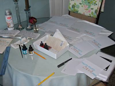 So there you go. General aversion to holiday traditions. Weird, right? But back to the Christmas card focus of this post. For some reason I absolutely cannot mail out store-bought Christmas cards. I've stood in line multiple times, my arms piled his with boxes of the perfect cards. One card for every person I've ever met. Sometimes I even get to the cashier and pay for them instead of putting them back on the shelf and bolting out of the store. But when I buy them I don't mail them. Only one miraculous year did I mail out cards and that was the year I made them myself. With my calligraphy set. And seeing as I only made it through two calligraphy lessons as a child, it took so long to make them that I only made about eleven.